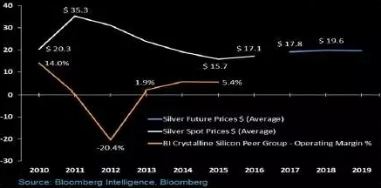 銀價(jià) VS 太陽(yáng)能電池生產(chǎn)商盈利趨勢(shì)對(duì)比圖