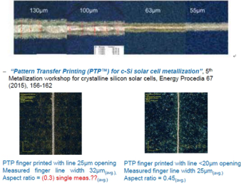 PTP 技術(shù)的最大優(yōu)勢(shì)在于它對(duì)金屬材料利用率高,并且與絲網(wǎng)印刷相比擁有更高的精度,可以打印更細(xì)的柵線(最細(xì)可達(dá)10μm)。因此,即便是使用標(biāo)準(zhǔn)工業(yè)漿料,PTP 技術(shù)也可以有效提升光伏電池轉(zhuǎn)換效率,保持電池的耐久性和可存儲(chǔ)性。