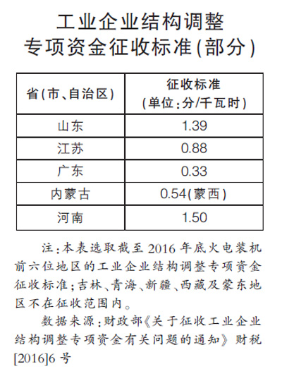 以華電章丘電廠為例。記者了解到,該電廠燃煤發(fā)電上網(wǎng)電價(jià)為0.35元/千瓦時(shí)左右,因其較早完成超低排放改造試點(diǎn)工作,獲批1分/千瓦時(shí)的超低排放電價(jià)。此外,脫硫、脫硝、除塵電價(jià)總計(jì)2.52分/千瓦時(shí)。相應(yīng)的,山東省內(nèi)工業(yè)企業(yè)結(jié)構(gòu)調(diào)整專項(xiàng)資金征收標(biāo)準(zhǔn)為1.39分/千瓦時(shí)。