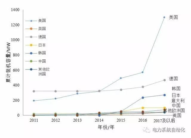 美國MW級(jí)儲(chǔ)能調(diào)頻項(xiàng)目數(shù)和裝機(jī)容量均以顯著優(yōu)勢(shì)領(lǐng)跑,意大利、德國、英國近幾年有較快發(fā)展趨勢(shì),韓國和日本相關(guān)項(xiàng)目于2015~2016年受到重視,中國則每年以平穩(wěn)速度推進(jìn)示范應(yīng)用。