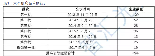 之前,工信部已經(jīng)公布了五批符合要求的企業(yè),并在今年根據(jù)后期的復(fù)查情況撤銷了一批企業(yè)。六批企業(yè)累計(jì)263家,撤銷19家,如今剩余名單內(nèi)企業(yè)共244家,如下表所示。