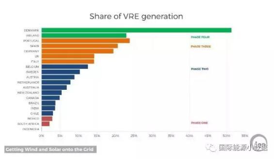第1階段:間歇性可再生能源占比低于3%,電力需求本身的波動(dòng)超過(guò)了間歇性可再生電源供應(yīng)的波動(dòng)幅度,所以間歇性可再生能源對(duì)于電網(wǎng)的運(yùn)行沒(méi)有明顯影響。處于這一階段的國(guó)家有印度尼西亞、南非、墨西哥。