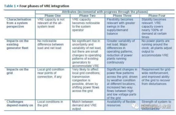 中國(guó)儲(chǔ)能網(wǎng)訊:國(guó)際能源署發(fā)布報(bào)告Getting Wind and Sun onto the Grid,按照電網(wǎng)吸納間歇性可再生能源(主要是風(fēng)電、光伏)的比例劃分了4個(gè)階段: