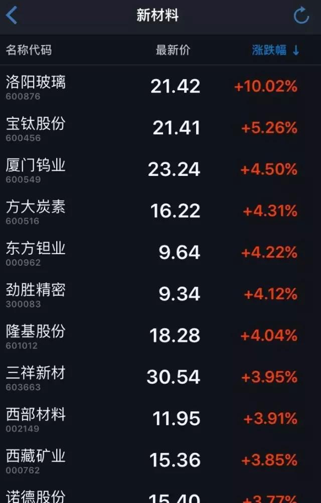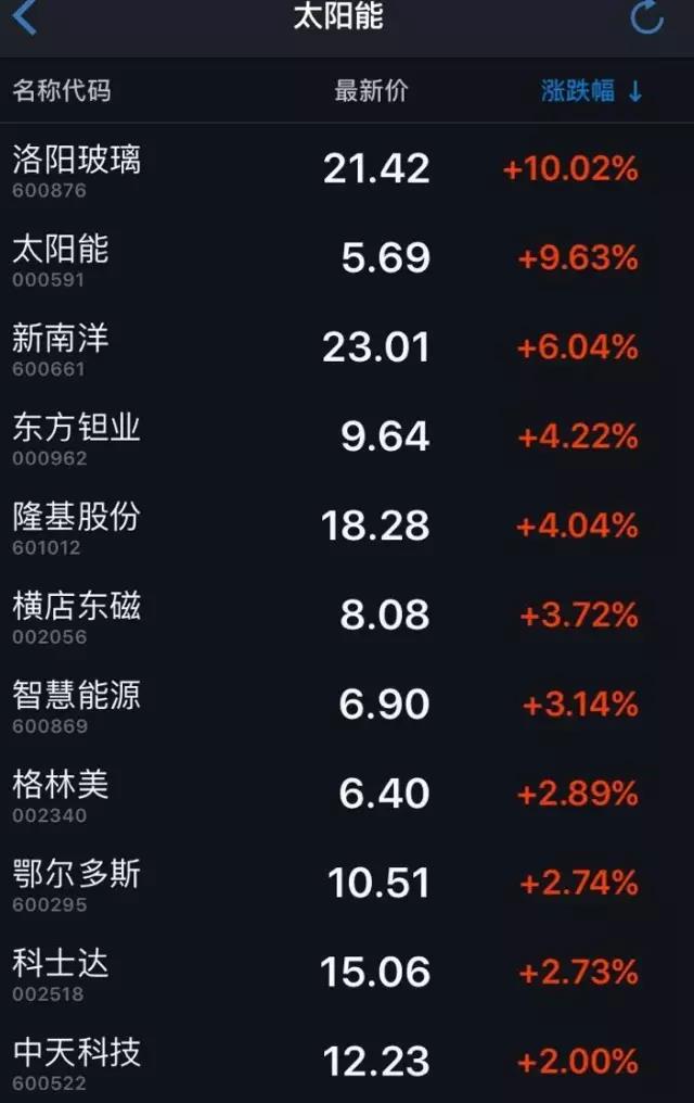 首先我們來看看隆基所處的幾個板塊漲幅:新材料和太陽能領域,上漲4%以上的公司不是太多,隆基排在前六。
