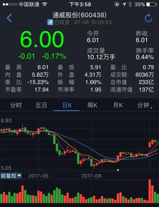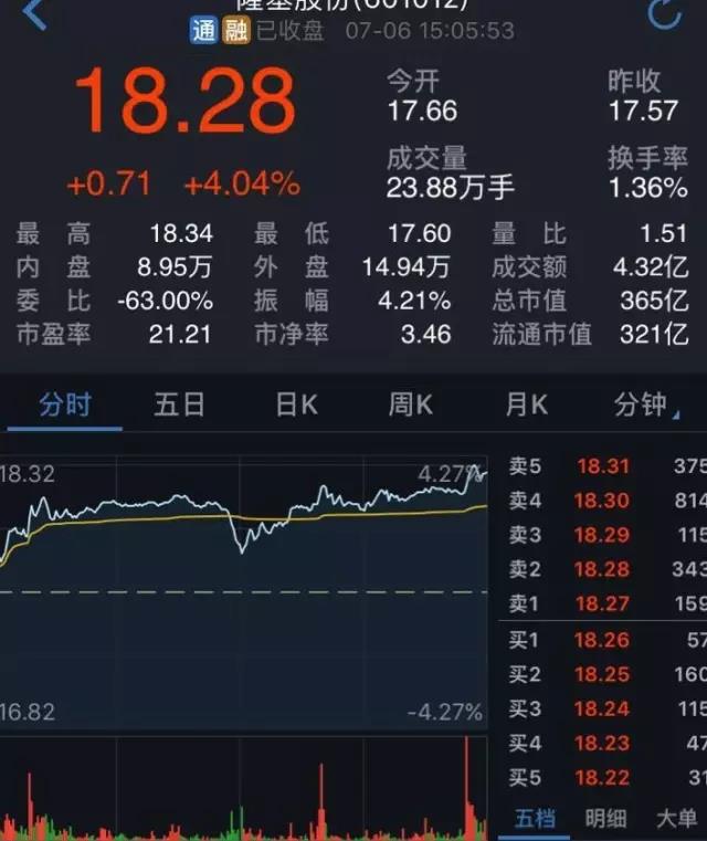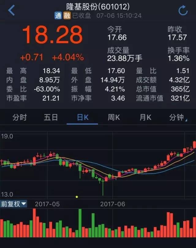 今日晨間,隆基股份以17.66元的價格開門迎客,此后很快沖高至18.32元,隨后中途有點下滑,但截至下午收盤時,它以全天的較高價18.28元收官。