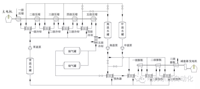 TICC-500的系統(tǒng)流程如圖1所示,系統(tǒng)主要由壓縮子系統(tǒng)、回?zé)嶙酉到y(tǒng)、儲(chǔ)氣子系統(tǒng)、透平發(fā)電子系統(tǒng)等四部分組成。壓縮子系統(tǒng)采用五級(jí)間冷活塞式壓縮機(jī),排氣壓力為10MPa,壓縮機(jī)每級(jí)的排氣溫度為150℃?;?zé)嶙酉到y(tǒng)由常溫水罐、中溫水罐、高溫水罐、水泵以及換熱器等組成,采用加壓水作為儲(chǔ)熱介質(zhì)。儲(chǔ)氣子系統(tǒng)采用兩個(gè)鋼制壓力儲(chǔ)氣罐,每個(gè)儲(chǔ)氣罐體積為50m3,儲(chǔ)氣總?cè)莘e為100m3。透平發(fā)電子系統(tǒng)包括空氣透平、減速器和發(fā)電機(jī)等??諝馔钙綖橄蛐膹捷S流式,采用三級(jí)同軸布置,級(jí)間再熱循環(huán),空氣透平的轉(zhuǎn)速為30000轉(zhuǎn)/分鐘,通過(guò)減速器將其轉(zhuǎn)速減至1500轉(zhuǎn)/分鐘,帶動(dòng)發(fā)電機(jī)對(duì)外輸出電能。