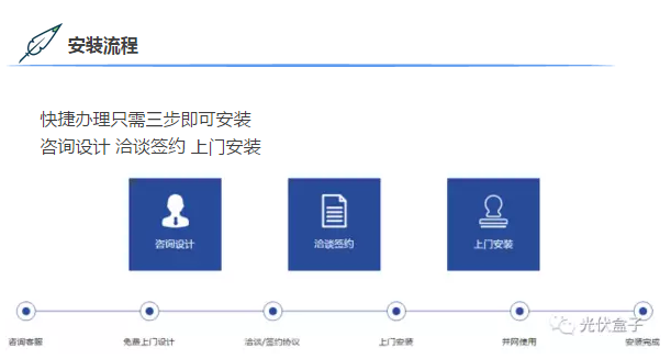 咨詢客服,免費(fèi)上門設(shè)計(jì),洽談/簽約協(xié)議,上門安裝,并網(wǎng)使用,安裝完成。
