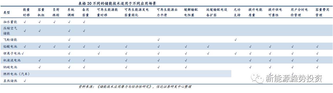 我們將各種儲能技術(shù)根據(jù)其不同的特性與應(yīng)用場景的需求進行配對,得到不同儲能技術(shù)最適用的應(yīng)用場景,隨著技術(shù)的進步,儲能技術(shù)能適用的場景也會發(fā)生改變。如飛輪儲能分為能量型和功率型,能量型飛輪儲能目前放電時間還較短,實際應(yīng)用價值不高,但是如果放電時間可以提升到時分級,則能量型飛輪儲能也能在可再生能源出力平滑等應(yīng)用場景中有一席之地。