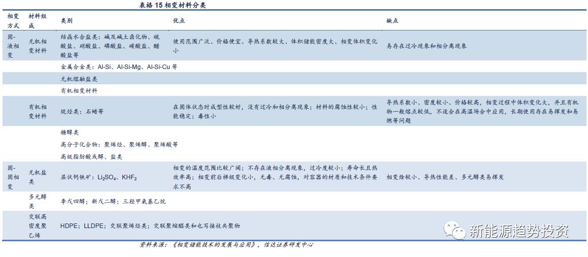 相變儲熱是利用箱變材料在物態(tài)變化時,吸收或放出大量潛熱而進行儲能。根據(jù)相變形式不同可以分為固-固相變、固-液相變和氣液相變,而依據(jù)相變材料不同可以分為有機相變材料和無機相變材料,每種類型下還可細分不同類型。理想的相變材料應(yīng)該具有以下性質(zhì):高焓值、導(dǎo)熱系數(shù)高、有合適的相變點、高比熱容、體積膨脹率小、無相分離和過冷現(xiàn)象、循環(huán)穩(wěn)定性高、腐蝕性小、不然、無毒、低成本,目前還沒有相變材料可以同時滿足上述所有條件。