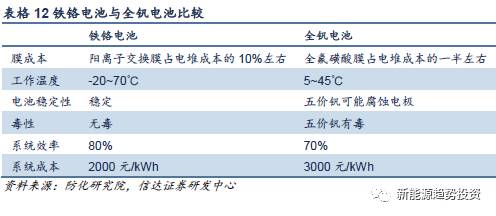 與全釩電池相比,鐵鉻電池有其獨到的優(yōu)勢,其中陽離子交換膜成本低是其最突出的特點,相比全釩電池的膜成本占電堆成本的約1/2,鐵鉻電池的膜成本只占電堆成本的10%。同時工作溫度廣,電池更穩(wěn)定。目前已有公司可以將鐵鉻電池系統(tǒng)成本降到2000元/kWh以下,有一定成本優(yōu)勢,但是由于尚未規(guī)?;瘧?yīng)用,技術(shù)有效性尚需進行實際驗證。