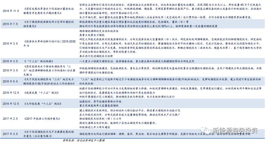 從國內(nèi)的政策看,自2009年《中華人民共和國可再生能源法修正案》中首次提及“儲能”以來,國家已出臺多個文件對儲能行業(yè)進行頂層規(guī)劃,然而從整體上看,單獨對儲能行業(yè)進行指導(dǎo)的政策性文件數(shù)量仍然不多,除去2014年針對抽水蓄能出臺了支持政策和補貼標準以外,直到2016年出于解決“三北”地區(qū)可再生能源消納問題能源局出臺了兩個通知,其主要針對的是電化學(xué)儲能技術(shù),對于儲能技術(shù)范圍及應(yīng)用場景限制頗多。因此在2017年3月的《關(guān)于促進儲能技術(shù)與產(chǎn)業(yè)健康發(fā)展的指導(dǎo)意見》(征求意見稿)中,國家對儲能技術(shù)和應(yīng)用場景不再做過多的限制。
