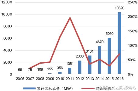 2010年,光伏發(fā)電剛剛崛起,全球并網(wǎng)的太陽能發(fā)電總裝機量為1.27GW,當時預(yù)計在2020年時全球裝機總量為42GW。而僅2016年全球新增太陽能光伏發(fā)電裝機容量就已約為66.7GW。
