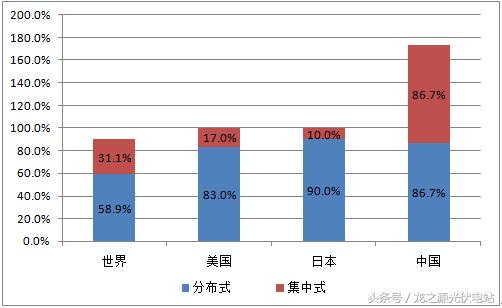 然而,中國的分布式光伏發(fā)電在光伏發(fā)電市場占比和其他國家還是有很大不同。中國分布式光伏裝機占比遠低于國外水平。如圖: