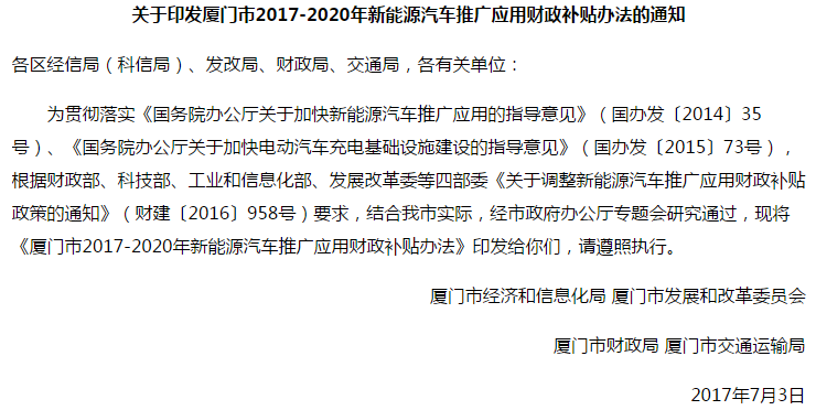 中國儲(chǔ)能網(wǎng)訊:近日,廈門市發(fā)布了《2017-2020年新能源汽車推廣應(yīng)用財(cái)政補(bǔ)貼辦法》。
