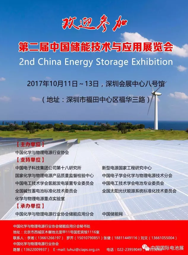 2017年,儲能技術(shù)在新能源微網(wǎng)、能源互聯(lián)網(wǎng)、多能互補、電能替代、備用電源、新能源汽車、光儲充電站等應(yīng)用領(lǐng)域和應(yīng)用類型逐步明晰,儲能應(yīng)用效果和應(yīng)用價值也日趨明確。為進一步推動儲能技術(shù)創(chuàng)新發(fā)展,加快儲能技術(shù)商業(yè)化應(yīng)用,中國化學(xué)與物理電源行業(yè)協(xié)會決定于2017年10月11—13日在深圳會展中心舉行“第二屆中國儲能技術(shù)與應(yīng)用展覽會”。本次展會由中國化學(xué)與物理電源行業(yè)協(xié)會儲能應(yīng)用分會和中國儲能網(wǎng)聯(lián)合承辦。