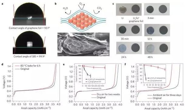 f) LixSi/石墨烯負極片耐空氣中H2O性能的考察(圖中黑色、紅色曲線分別為未暴露于空氣、暴露于空氣中(相對濕度20~60%,時間3天)后電池材料的電壓-容量曲線);