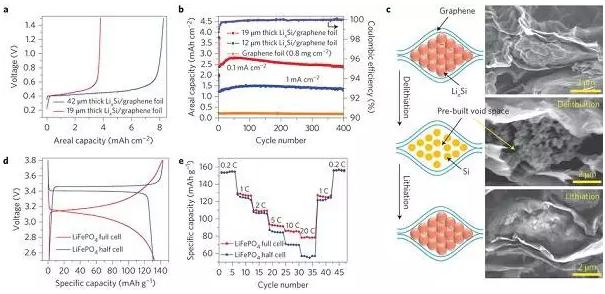 c)LixSi/石墨烯材料嵌鋰-脫鋰圖示(右側SEM圖中比例尺2um);和e)LixSi/石墨烯- LiFePO4電池(全電池)與Li - LiFePO4電池(半)的充放電性能曲線對比;