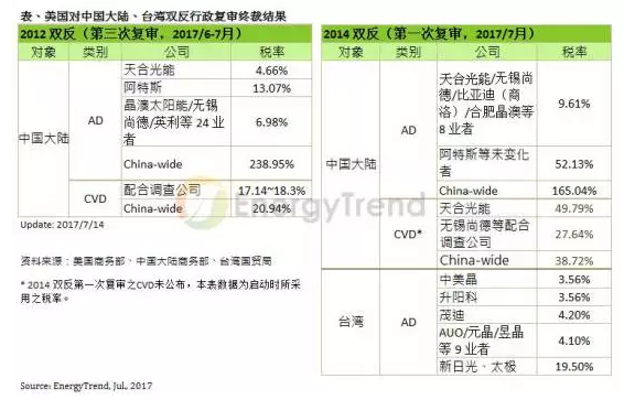 美國對(duì)兩岸的光伏雙反調(diào)查共分為五個(gè)案號(hào),分別為2012年對(duì)中國大陸的反傾銷與反補(bǔ)貼、2014年對(duì)中國大陸的反傾銷與反補(bǔ)貼、以及2014年對(duì)臺(tái)灣的反傾銷,并且分別在不同的行政復(fù)審階段。目前根據(jù)中、臺(tái)、美三方官方單位所發(fā)布的消息,已經(jīng)確定終裁的行政復(fù)審結(jié)果如下: