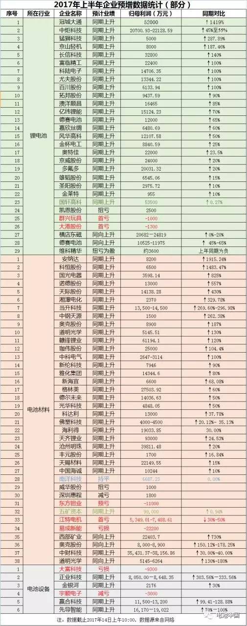 29家鋰電生產(chǎn)企業(yè)中,冠城大通預(yù)計2017年上半年業(yè)績同比增長1419%,領(lǐng)跑鋰電生產(chǎn)企業(yè);大港股份和群興玩具則出現(xiàn)首次虧損,虧損額分別為1300萬元和1000萬元。38家鋰電材料生產(chǎn)企業(yè)中,安納達、科恒股份領(lǐng)跑材料企業(yè),南洋科技利潤與上年同期持平,東方鉭業(yè)、江特電機、易成新能或出現(xiàn)不同程度的虧損。6家設(shè)備企業(yè)中,大富科技、宇順電子業(yè)績不佳,而正業(yè)科技漲幅最高,達約333%。