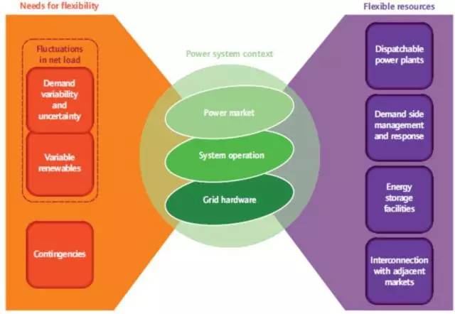 IEA將風(fēng)電和光伏統(tǒng)稱為VariableRenewableEnergy,即VRE。作為風(fēng)電和光伏的統(tǒng)稱,VRE很好的概括并體現(xiàn)了風(fēng)電和光伏發(fā)電的特點(diǎn)。而解決VRE的消納問題,關(guān)鍵則在于電力系統(tǒng)柔性是否充足。柔性一詞在歐美國家較為常用,根據(jù)IEA的定義,柔性(Flexibility)是描述一個(gè)電力系統(tǒng)應(yīng)對(duì)可預(yù)期的或者不可預(yù)期的變化的能力,以此保證發(fā)電和用電的平衡。也就是說柔性是描述一個(gè)電力系統(tǒng)應(yīng)對(duì)突發(fā)“不平衡事件”的能力,體現(xiàn)為單位時(shí)間內(nèi)向上或向下輸出一定功率的能力。當(dāng)電力系統(tǒng)出現(xiàn)負(fù)荷波動(dòng)或不確定性,以及發(fā)電機(jī)組突然停機(jī)脫網(wǎng)等特殊情況時(shí),電力系統(tǒng)都需要通過柔性源加以應(yīng)對(duì)。隨著可再生能源發(fā)電規(guī)模的增加,電力系統(tǒng)的柔性能力顯得愈發(fā)重要。為什么提供柔性能力的是柔性源而不是發(fā)電機(jī)組呢?因?yàn)槿嵝栽床恢皇前l(fā)電機(jī)組,還包括現(xiàn)貨市場(chǎng)(通過電價(jià)信號(hào)引導(dǎo)負(fù)荷)、需求響應(yīng)(demandresponse)、儲(chǔ)能和區(qū)域間聯(lián)絡(luò)線(跨區(qū)或者跨國電力交易)等多種方式,如下圖所示。