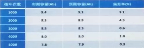 該方法以1000次循環(huán)實(shí)測(cè)數(shù)據(jù),針對(duì)3000次循環(huán)以內(nèi)的容量預(yù)測(cè)較為準(zhǔn)確,由于未考慮循環(huán)過(guò)程中電化學(xué)極化等因素造成的非線性衰退等因素,長(zhǎng)期循環(huán)預(yù)測(cè)的準(zhǔn)確度較差,呈明顯的離散趨勢(shì)。