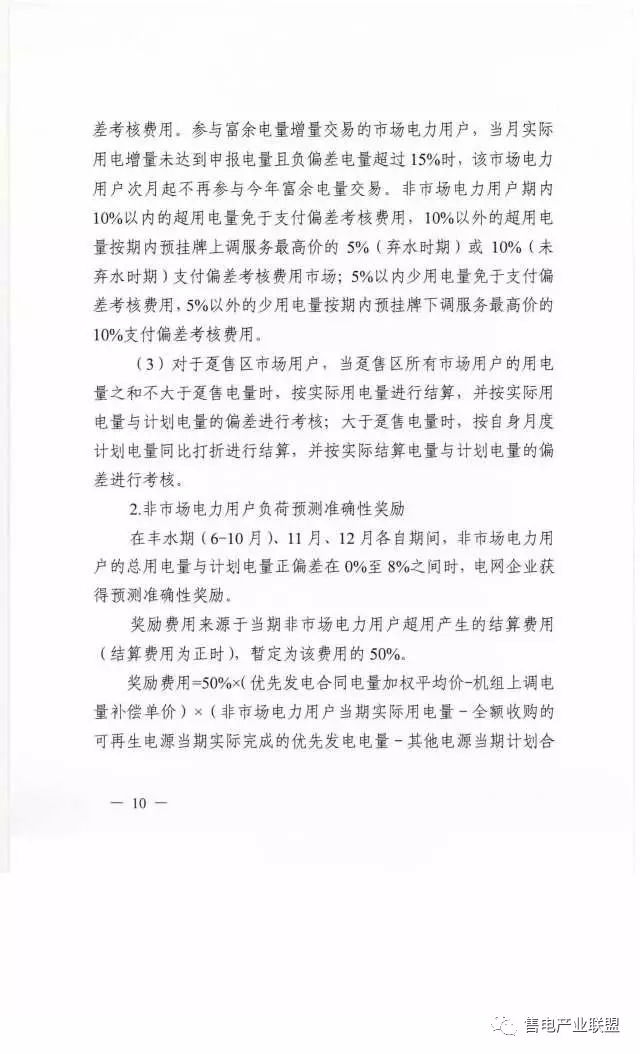 1-5月按現(xiàn)行方式進行考核,并完成相應清算,鑒于今年特殊情況,調(diào)整6-12月用電側(cè)考核費用為:市場電力用戶、售電企業(yè)、非市場電力用戶6-10月按水期進行考核,11、12月按月進行考核,市場電力用戶、售電企業(yè)期內(nèi)(或月內(nèi),下同)10%以內(nèi)的超用電量免于支付偏差考核費用,10%以外的超用電量按期內(nèi)預掛牌上調(diào)服務最高價的5%(棄水時期)或10%(未棄水時期)支付偏差考核費用市場;期內(nèi)5%以內(nèi)少用電量免于支付偏差考核費用,5%以外的少用電量按其合同加權(quán)的10%支付偏差考核費用。