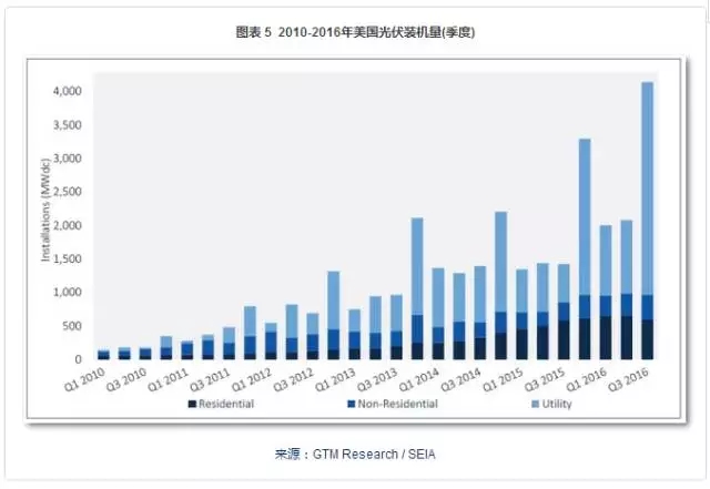 美國(guó)2016全年光伏裝機(jī)14.76GW,裝機(jī)量同比增長(zhǎng)97%,其中公共事業(yè)裝機(jī)量起到了主要的拉動(dòng)作用。