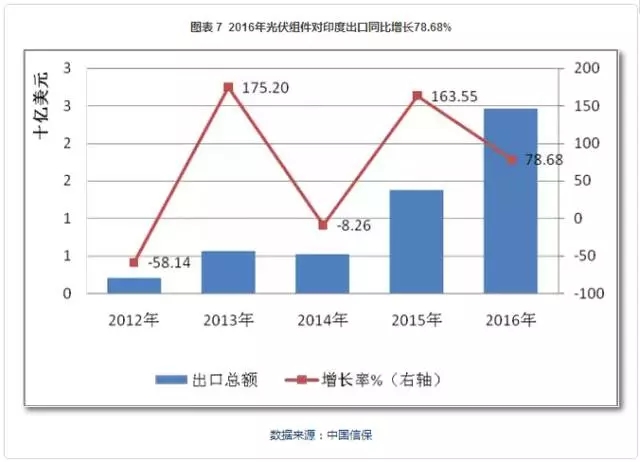 印度在2016年一躍成為我國(guó)光伏組件出口的第二大市場(chǎng),2016年,我國(guó)對(duì)印度光伏組件出口金額24.59億美元,較2015年同比增長(zhǎng)78.68%。