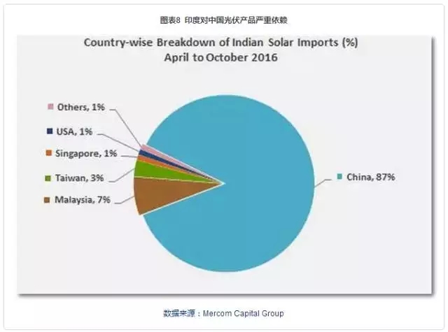 在我國(guó)光伏組件對(duì)印出口大幅上升的同時(shí),印度光伏行業(yè)對(duì)中國(guó)產(chǎn)品的依賴度也在上升,據(jù)印度商務(wù)部統(tǒng)計(jì),在2016年4-10月期間,在印度光伏產(chǎn)品進(jìn)口來(lái)源國(guó)中,中國(guó)產(chǎn)品已經(jīng)占據(jù)了87%的市場(chǎng),其次為馬來(lái)西亞,但占比僅7%,排在第三位的中國(guó)臺(tái)灣,占比也僅有3%。
