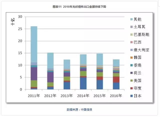 日本仍為我國(guó)光伏組件出口的第一大市場(chǎng),但2016年,我國(guó)對(duì)日光伏組件出口金額28.34億美元,較2015年同比下滑26.80%。
