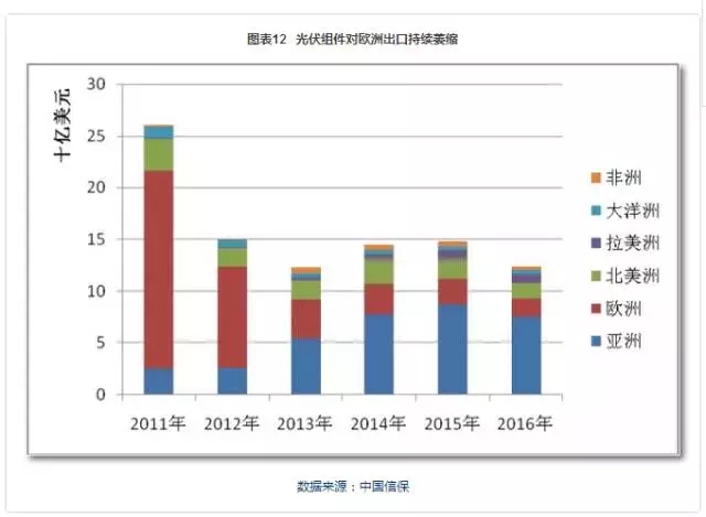 從洲別市場(chǎng)來(lái)看,2016年我國(guó)光伏組件對(duì)所有洲別市場(chǎng)出口額均表現(xiàn)為同比下滑。