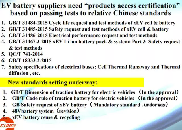 正在制定中的國標有,動力電池尺寸標準、編碼規(guī)則、安全要求(強制性)、48V系統(tǒng)、動力電池回收再利用