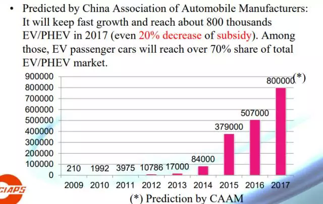 2017年盡管會降低新能源汽車20%補貼,仍然會保持高速的增長達到80萬輛,乘用車將占據(jù)70%的新能源車份額