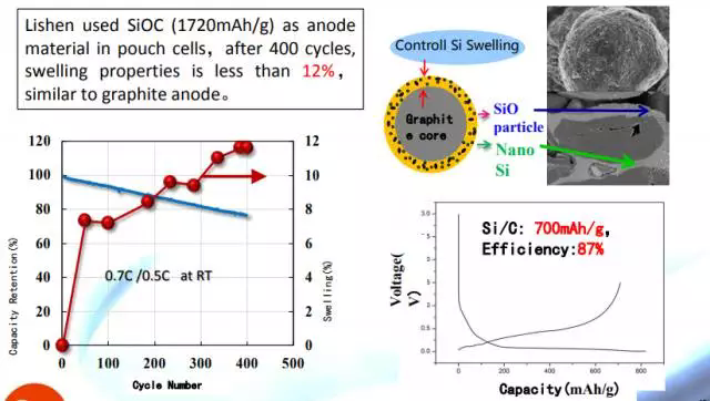 通過新技術(shù)改善硅的膨脹和電池的循環(huán)性能,力神軟包電池使用SiOC負極材料,400周循環(huán)后膨脹小于12%達到了和石墨負極類似