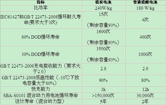 表1 鉛炭電池與普通鉛酸電池的技術(shù)指標(biāo)對比表