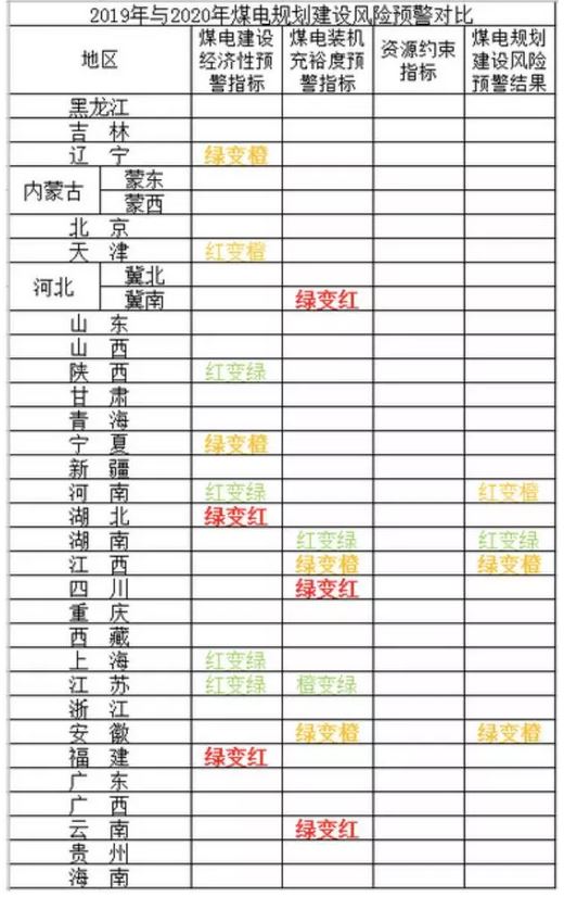 “資源約束指標基于各省(區(qū)、市)的大氣污染物排放、水資源量、煤炭消費總量以及其他相關資源情況,分為紅色、綠色兩個等級。對于大氣污染形勢嚴峻、水資源量不足、煤炭消費總量亟需控制,或者存在其它資源約束煤電規(guī)劃建設的,資源約束指標為紅色預警;其余為綠色?!?