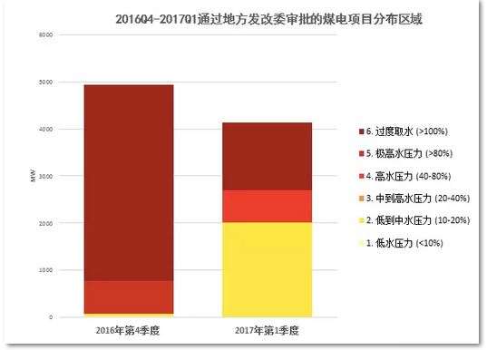 在進一步梳理各省發(fā)改委公布的煤電核準信息以及環(huán)評審批數(shù)據(jù)時大嘴君發(fā)現(xiàn),2016年第四季度和2017年第一季度地方發(fā)改委新審批的煤電項目中,有超過60%的煤電項目位于“過度取水”區(qū),同時有超過80%的項目位于高水壓力區(qū)。