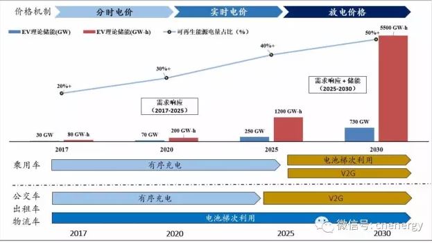 值得注意的是,《報告》發(fā)布了新能源發(fā)電與電動汽車協(xié)同發(fā)展路線圖(如圖2)?!叭鐖D所示,可再生能源發(fā)電量占比將從目前25%提升至50%以上,電動汽車儲能理論潛力也將從目前的30GW-100GWh提升至700GW-3800GWh?!眲詮?qiáng)調(diào),在不同時段引入合理的價格機(jī)制和并網(wǎng)模式是發(fā)掘電動汽車儲能潛力的關(guān)鍵。