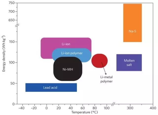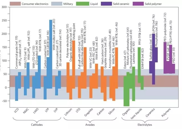 圖2. 典型電池材料的工作溫度極限
