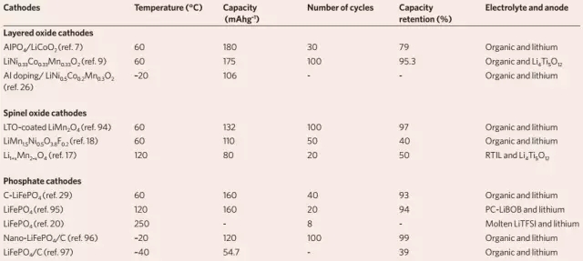 表1. 可在極端溫度條件下工作的正極材料