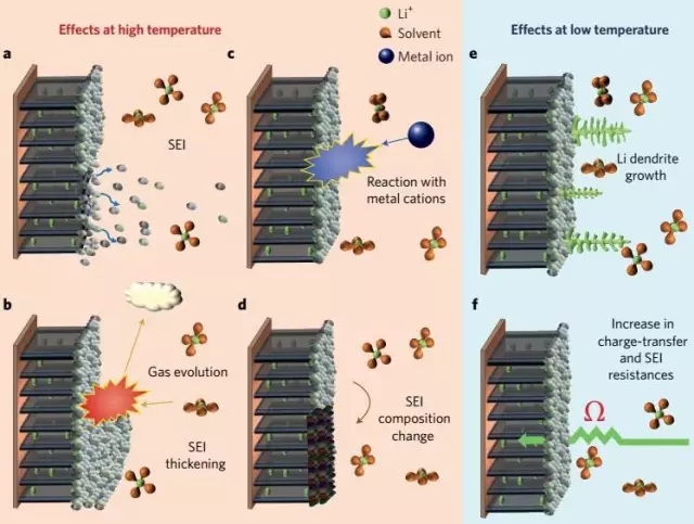 低溫條件下,電解質(zhì)粘度增加,阻礙離子遷移和電極潤濕性,降低比率性能;而且,導(dǎo)電性降低將引起電極周圍鋰離子的消耗。高溫條件下,電解質(zhì)容易發(fā)生化學(xué)變化,并和帶電的電極發(fā)生反應(yīng)。