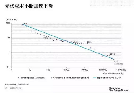 7月25日,彭博新能源財(cái)經(jīng)在京舉辦《2017新能源展望》發(fā)布會(huì),會(huì)上,彭博新能源財(cái)經(jīng)提供出更多數(shù)據(jù)來(lái)支撐這一趨勢(shì)預(yù)測(cè)——隨著光伏的快速發(fā)展,太陽(yáng)能發(fā)電成本不斷加速下降,將更進(jìn)一步加快煤電的“死亡”。