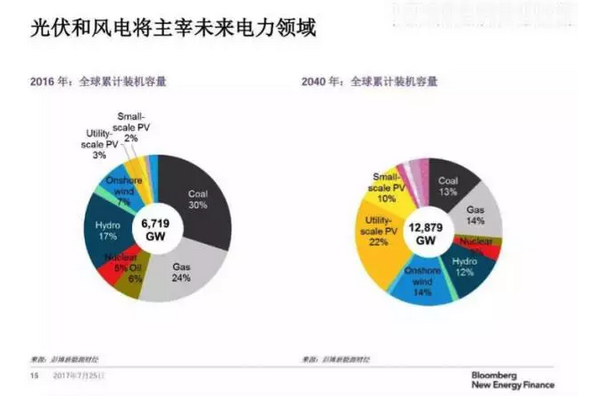 根據(jù)預(yù)測(cè)報(bào)告顯示,預(yù)計(jì)新增可再生能源的投資總額將在2040年前達(dá)到7.4萬(wàn)億美元,占全球新增發(fā)電投資總額10.2萬(wàn)億美元中的72%。其中,太陽(yáng)能投資占2.8萬(wàn)億美元,裝機(jī)容量將躍增14倍,風(fēng)電投資占3.3萬(wàn)億美元,裝機(jī)容量將增加4倍。到2040年風(fēng)電和太陽(yáng)能將占全球裝機(jī)總?cè)萘康?8%及發(fā)電量的34%,分別較目前的12%和5%有巨大提升。