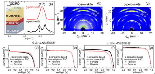 圖(a)略入射XRD測(cè)量示意圖,以及有機(jī)-無(wú)機(jī)雜化鈣鈦礦薄膜的略入射XRD譜(X光入射角度0.2度)。(b)CH3NH3PbI3-xClx薄膜二維GI-XRD譜;(c)優(yōu)化薄膜后處理?xiàng)l件后測(cè)量的二維GI-XRD譜。基于(d) r-和(e) g-鈣鈦礦薄膜的反式P-i-N結(jié)構(gòu)器件J-V曲線。(f)和(g)為正式N-i-P結(jié)構(gòu)器件J-V曲線。