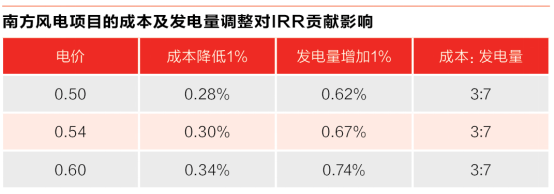 針對(duì)北方風(fēng)電場(chǎng)和南方風(fēng)電場(chǎng)的不同特點(diǎn),曹志剛給出了具體的破局路徑:北方項(xiàng)目應(yīng)以降本為主,“通過(guò)擴(kuò)大項(xiàng)目規(guī)模,共用升壓站、接入送出系統(tǒng)、場(chǎng)內(nèi)道路等來(lái)拉低項(xiàng)目初始投資?!蹦戏巾?xiàng)目應(yīng)以提高發(fā)電量為主,“在目前電價(jià)情況下,成本降低1%對(duì)IRR影響約0.25%~0.34%,發(fā)電量增加1%對(duì)IRR影響約0.58%~0.74%,成本與發(fā)電量對(duì)IRR的貢獻(xiàn)影響比約為3:7?!?