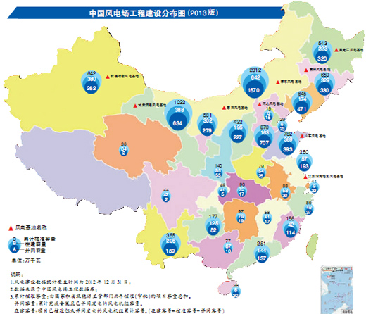 到2012年底,全國(不含港澳臺(tái))共建有1445個(gè)風(fēng)電場(chǎng),吊裝風(fēng)電機(jī)組52827臺(tái),累計(jì)吊裝容量7021萬千瓦,累計(jì)建設(shè)容量6525萬千瓦,累計(jì)并網(wǎng)容量6266萬千瓦,約占全國電源總裝機(jī)容量的5.5%。