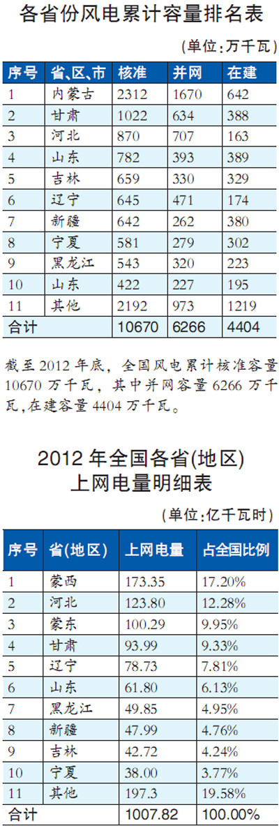 至2012年底,全國累計(jì)風(fēng)電吊裝容量7021萬千瓦,累計(jì)建設(shè)容量6525萬千瓦,累計(jì)并網(wǎng)容量6266萬千瓦。全國共有14個(gè)?。▍^(qū))風(fēng)電累計(jì)并網(wǎng)容量超過百萬千瓦,其中內(nèi)蒙古并網(wǎng)容量1670萬千瓦,居全國之首,河北和甘肅分別以并網(wǎng)707萬千瓦和634萬千瓦位居第二、三位。華北、東北、西北地區(qū)風(fēng)電并網(wǎng)容量約占全國風(fēng)電并網(wǎng)容量的86%。