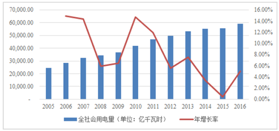 我國(guó)2005 年至2016 年全社會(huì)用電量及年增長(zhǎng)率變化情況如下:
