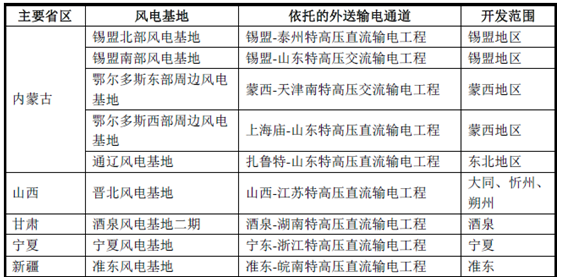“十三五”期間“三北”地區(qū)跨省跨區(qū)外送風(fēng)電基地規(guī)劃(含存量項(xiàng)目)如下: