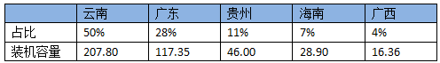 按區(qū)域分布看,云南光伏發(fā)電占比最大,裝機容量208萬千瓦,占比達到50%,其次分別是廣東(117萬千瓦)、貴州(46萬千瓦)、海南(29萬千瓦)和廣西(16萬千瓦)。